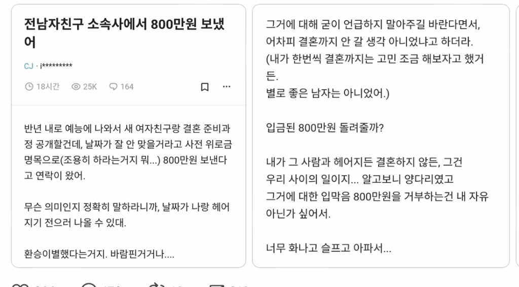 앞서 직장인 익명 커뮤니티에는 ‘전 남자친구 소속사에서 800만 원을 보냈다’는 제목의 글이 올라와 파장을 일으켰다. 작성자는 “소속사 관계자가 ‘반년 내 예능에서 결혼 준비 과정을 공개할 텐데 날짜가 잘 안 맞을 수 있다’며 위로금 800만 원을 제안했다”고 주장, 환승 연애와 입막음 논란을 동시에 제기했다.