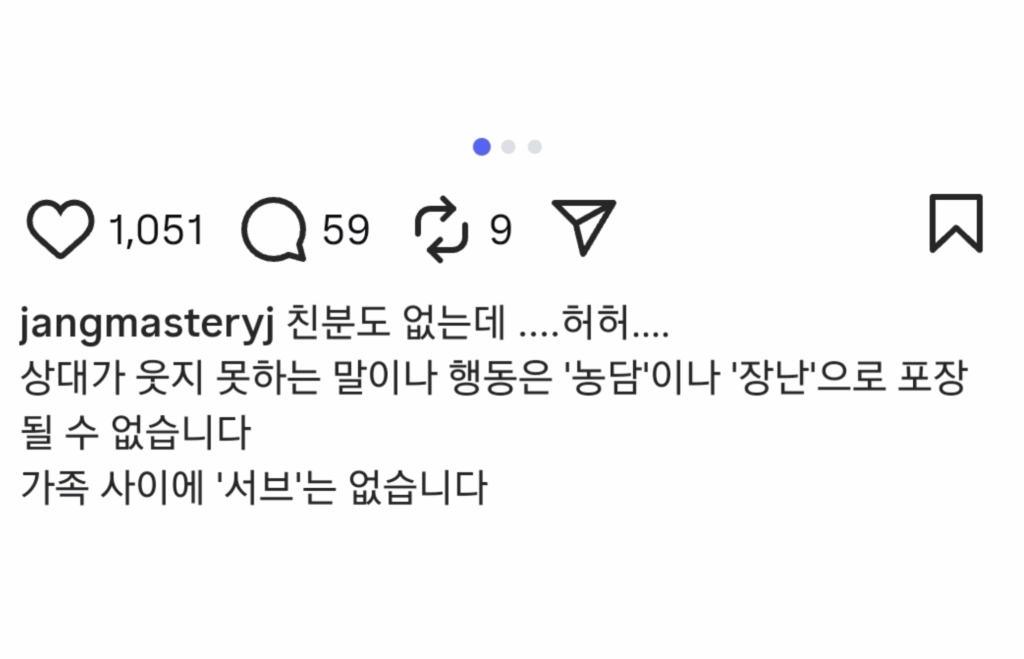 방송 이후 장윤정은 자신의 SNS를 통해 “친분도 없는데 허허”라며 불쾌한 심정을 드러냈다. 또 “상대가 웃지 못하는 말이나 행동은 농담이나 장난으로 포장될 수 없다”며 “가족 사이에 ‘서브’는 없다”고 적어 씁쓸한 마음을 드러냈다.